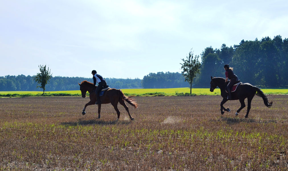 Im Galopp über´s Stoppelfeld: Gesche Reimers mit Deichgraf und Birgit Meyer-Thaut mit Frida